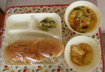 チンゲンサイともやしのピり辛あえ パン(レーズンパン) 牛乳