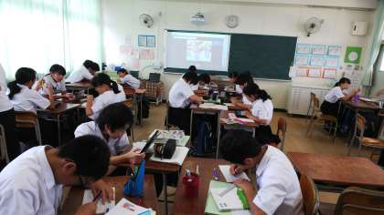 2年生の国語の授業でタブレットを使って学習しています。大阪について調べているところです。大阪の食べ物や、名所、年中行事、ことば(大阪弁)などについて調べて、つくった資料をもとに「大阪のよさ」についてプレゼンテーションをする予定です。