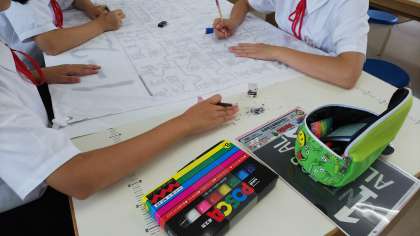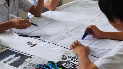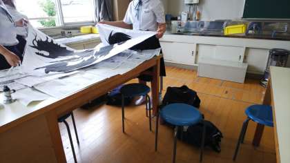 各学年とも,9月の運動会で使う学級旗の制作をはじめました。各クラスで募集した原画から選んで制作しています。