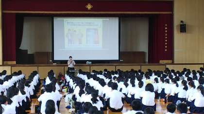 19日に、全校生徒を対象に体育館で、「携帯安全教室」を行いました。講師の方にご来校いただき、スマートフォンや携帯電話の使い方について話をしていただきました。
