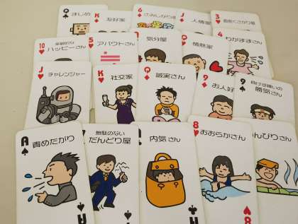 その名のとおり、いろいろなトランプ(下の写真参照)を用いて行いました。トランプの中から、自分に当てはまるカードを10名選び出して分析をしました。そして、自分自身の“らしさ”について考えました。