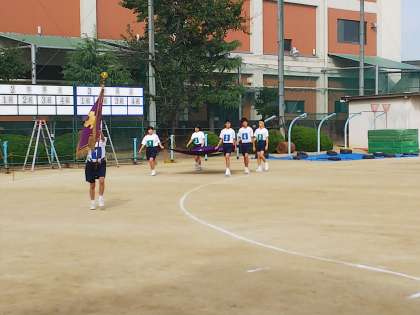 上の写真は入場行進のようすです。生徒会の役員が校旗をもって入場します。