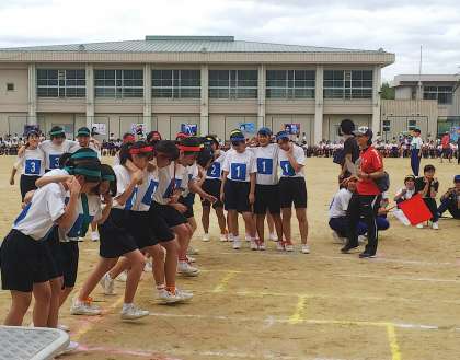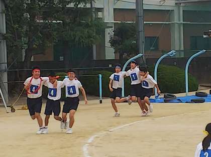 三人4脚リレーです。スタートとカーブでのトップ争いです。