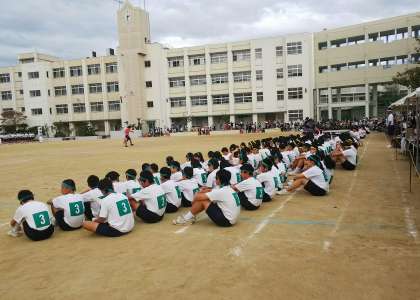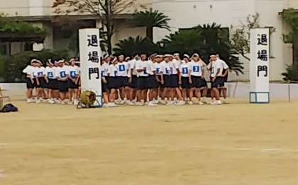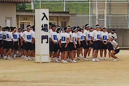 プログラムの最後を飾るのは、3年生の学年演技です。1.2年生は本部前で見学。