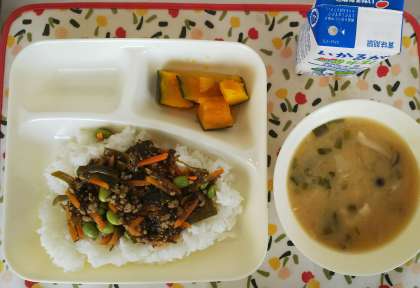 焼きかぼちゃの甘みつかけ ごはん 牛乳