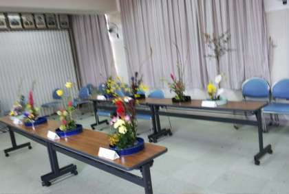 多目的室の作品です。上が茶華道部の生徒作品、下が社会見学の際に作成したPTAの作品です。