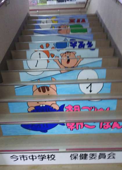 写真は、本館校舎の北側の階段(1階から2階へいくところ)にある階段アートです。