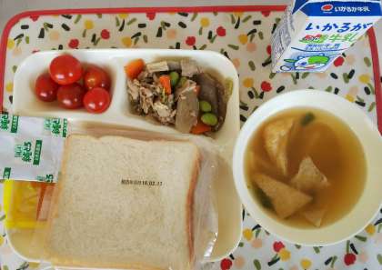 そこで、大阪市の給食では、「きつねうどん」をイメージして、三角に切って、甘辛く煮たうすあげと、かまぼこ、青ねぎを入れました。さらに「とろろこんぶ」をのせて食べるので「なにわうどん」と名付けられました。