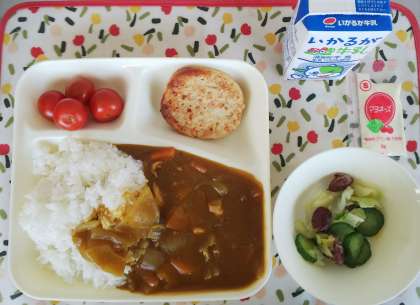 金時豆と野菜のサラダ プチトマト マヨネース 牛乳