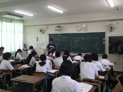 4時間目に数学の研究授業を行いました。直線の方程式を考える授業です。傾きと通る点の座標が分かっているときの求め方から学んでいました。2点がわかっているときも傾きを求める方法で解いている生徒が多かったです。連立方程式はあまり利用していませんでした。