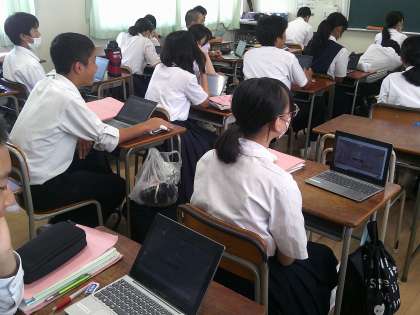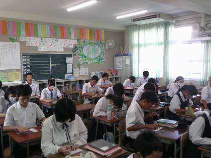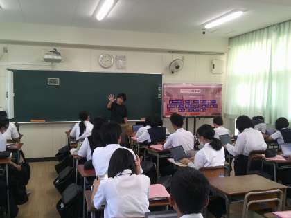 6時間目に英語の研究授業を行いました。最初に、曜日を英語で表現できるかを、カフートを使って確認しました。動詞+人+物の表現を班になって考えました。