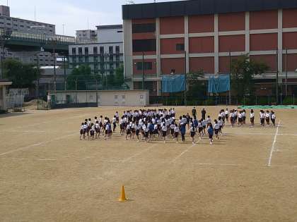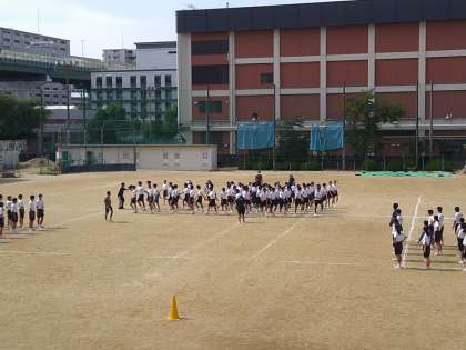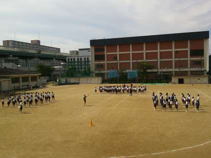 団体演技の練習をしています。動きがうまくいくと大きな拍手が送られていました。