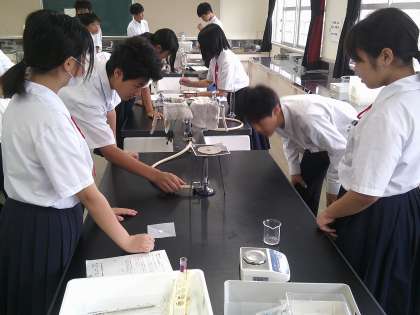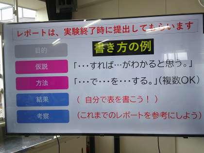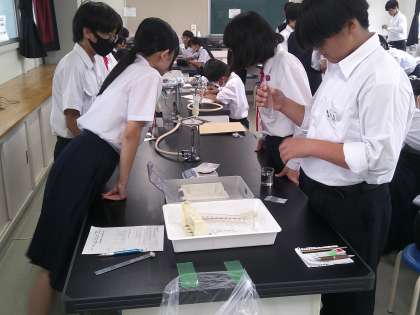 1時間目の授業の様子です。白い物質が何かを調べます。『見ため』『触る』『嗅ぐ』『燃焼』『水に溶かす』色々な方法で判断します。
