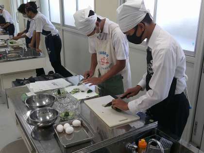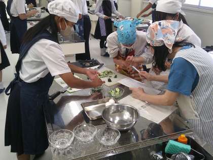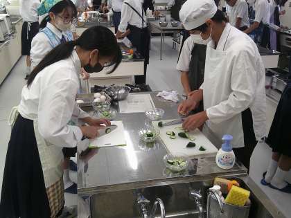 2時間目の家庭科の授業の様子です。調理実習をしています。きゅうりを『輪切り』『斜め切り』『せん切り』3種類の切り方で切ります。卵焼きにも挑戦します。