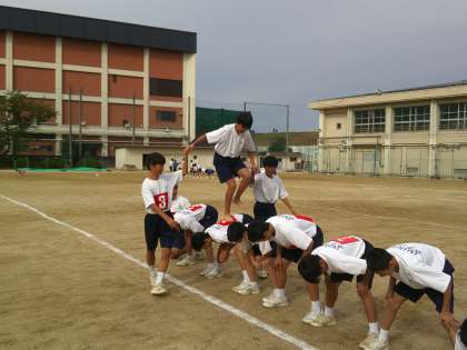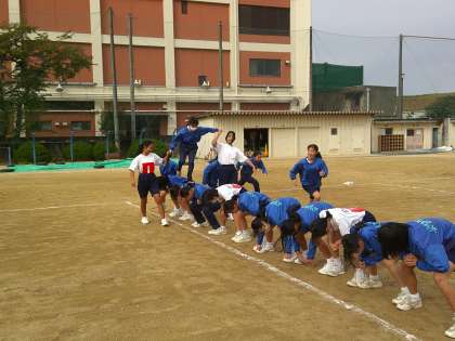 1時間目の体育の授業の様子です。運動会の学年種目の練習をしています。仲間が作る橋を渡っていきます。