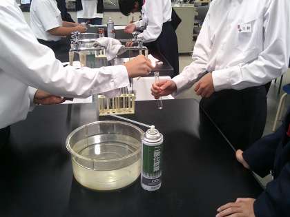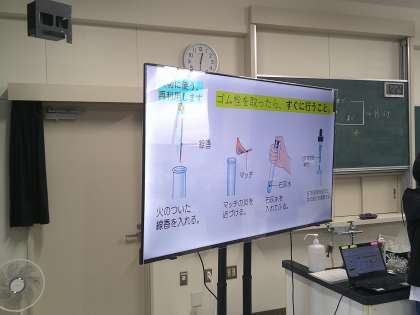 集めた気体を次の動作をして、反応を観察します。『火のついた線香を入れる』『マッチの炎を近づける』『石灰水を入れる』『BTB溶液を入れる』