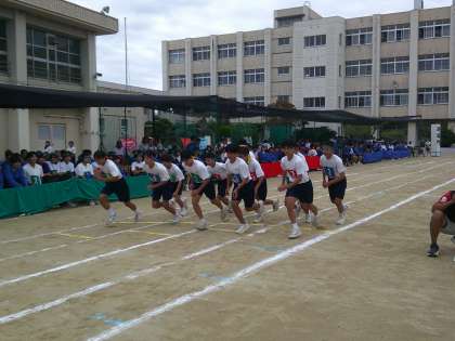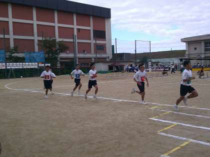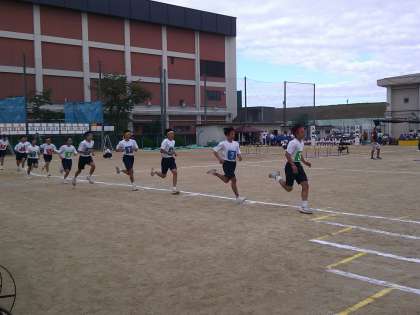 プログラム3番、1000m走です。全学年の男子が、一斉にトラックを8周ちょっと走ります。鐘が鳴ると最後の一周です。