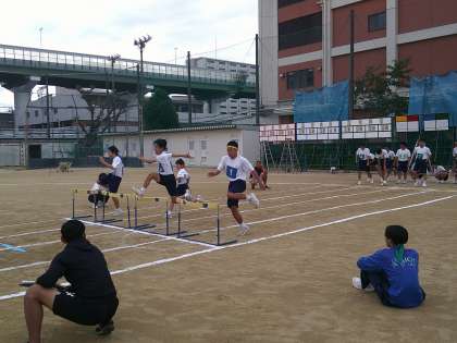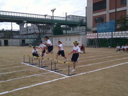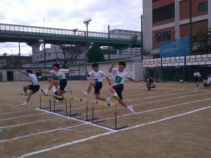 プログラム4番、50mハードル走です。5つのハードルを越えてゴールを目指します。短距離直線決戦です。