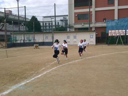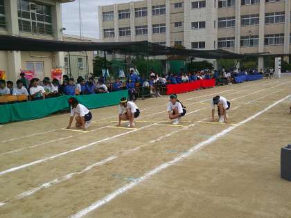 プログラム5番、100m走です。トラック半周を走ります。最初の直線はセパレートコースで、最初のコーナーからオープンコースになります。