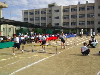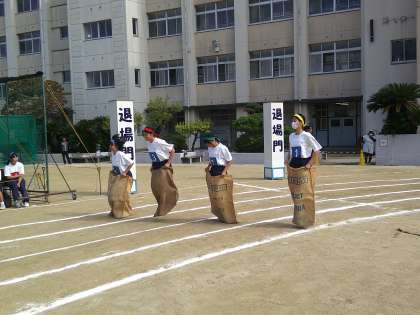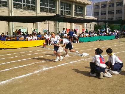 プログラム8番、バラエティ競争です。両足を麻の袋に入れて両足跳びで10m進みます。次に2台のハードルを飛び越えたあと、土嚢を15m運びます。さらに、マットで1回前回りをし、最後にネットをくぐりぬけて、一気にゴールを目指します。