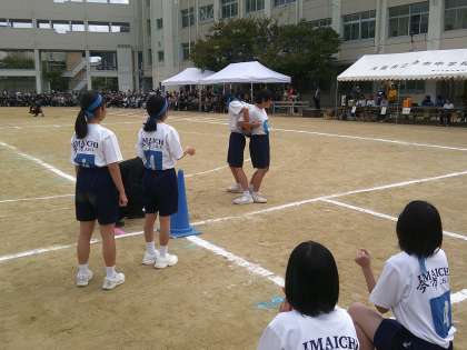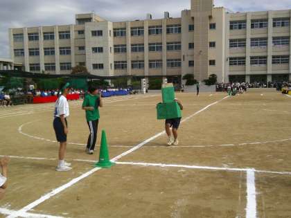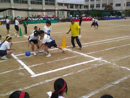 プログラム11番、全員リレー2nd『ピンポン運び』『宅配リレー』『ボール運び』『背中合わせボール運び』『なわとび』『二人三脚』『土のう運び』『ほうき運び』『ぐるぐるバット』『借り物競争』の競技でバトンをつないでいきます。