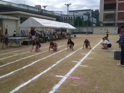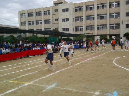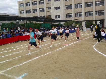 プログラム14番、部活動リレーです。運動部の男子、女子、文化部のレースがおこなわれます。文化部のレースには教員も参加します。