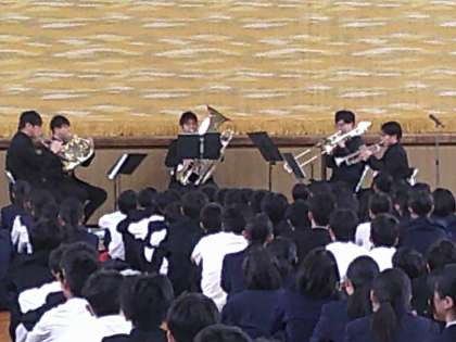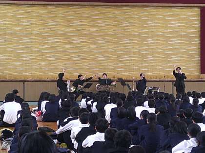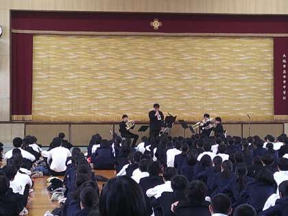 5、6時間目に大阪芸術大学ブラスアンサンブル『GIFT』の方にきていただき、金管五重奏の演奏をしていただきました。演奏に触れて、豊かな感性を養い、音楽に対する理解を深め、芸術を楽しむ態度を育成できたらと思います。