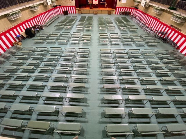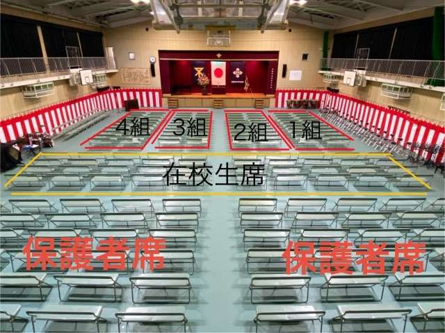 新入生は9時に教室集合、保護者は受付を済ませて、体育館前へ。