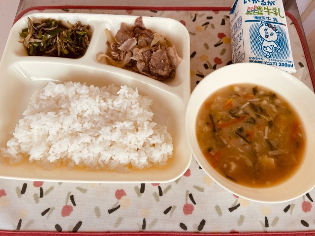 豚肉の甘辛焼き、とうふのみそ汁、じゃこピーマン、ごはん、牛乳です。