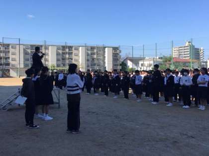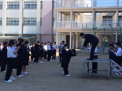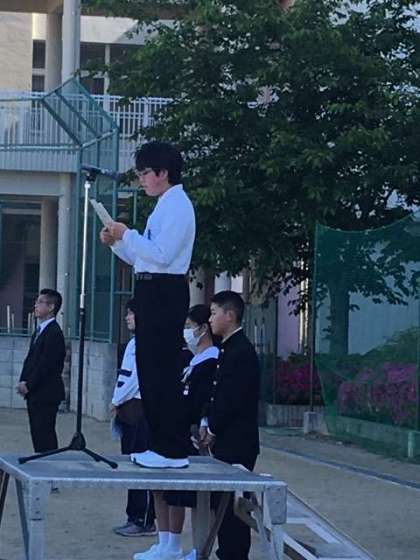 元号が令和になって、初の全校集会が行われました。集会遅刻者も見られましたが、気持ちを切り替えて、爽やかな風を受けながらほとんどの生徒がしっかり整列できていました。認証式もあり、代表の委員長が校長先生から認証状を受け取りました。また、本日は大阪市の「いじめを考える日」であり、1時間目の道徳の授業の取り組みに向けて、生徒会長からメッセージが伝えられました。