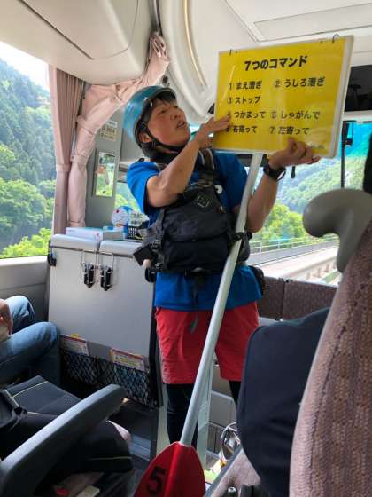 午後からはラフティング体験です。晴れてよかった。インストラクターからの説明です。