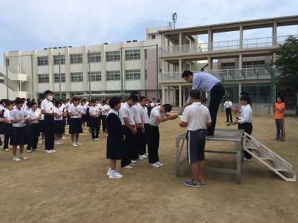 例年より梅雨入りが遅れて、まだ風が爽やかに感じられる朝の時間、全校集会が行われました。