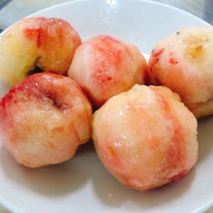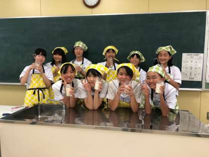 放出中学校の「桃」、管理作業員さんが採ってきてくださいました。家庭科部で、この桃にお砂糖と牛乳を加えて美味しいスムージーを作りました。できあがったばかりの手作りエプロンをつけて少しテンションがあがっている様子もご覧ください。