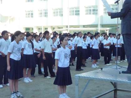 台風一過、雲一つない秋空のもとで全校集会を行いました。