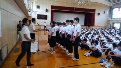 夏休み中の大会にて、吹奏楽部、柔道部、卓球部、水泳部、剣道同好会のメンバーが表彰されました。(その1)詳細はHP内の記事にてごらんいただけます。