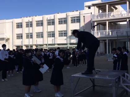 美術部員の木村さん、前田さん、中川さんが放出の地域体育祭のポスターを作成し、表彰を受けました。