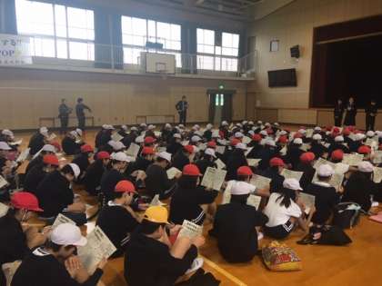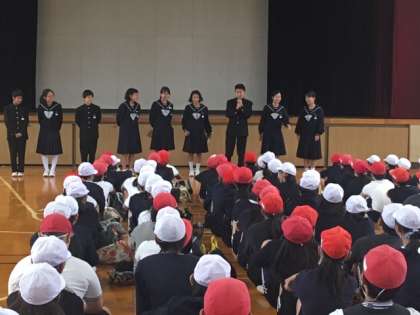 まず体育館に集合。、中学校生徒会代表メンバーがオリジナルのプリントを配布して学校生活の紹介をしました。