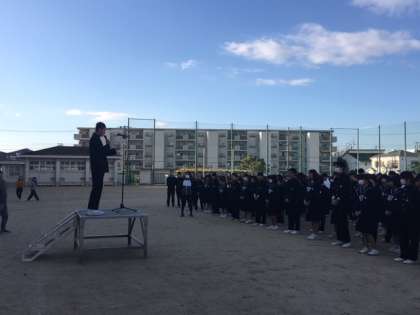 校長先生のお話の一部:各部活動、ますます頑張っている様子。その中で今日は吹奏楽部の活動を紹介します。吹奏楽部は文化祭や放中祭でも活躍しましたが、学校外でのボランティアにも取り組んでいます。11月30日土曜日には医療法人晃和会介護老人保健施設にて演奏しました。また、今月21日土曜日には、城東区民センターにて、警察音楽隊安全安心まちづくりコンサートに出演します。他の部活動の様子をなかなか知る機会がありませんが、いろいろな場所で放出中学校の仲間が頑張っていることを心にとめておいてください。