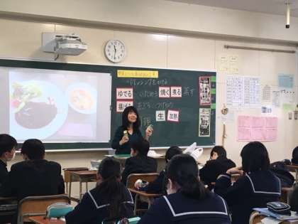 校内で、各教科の研究授業を進めています。本日は家庭科の授業を紹介させていただきます。2年生の家庭科では野菜について学んでいます。スーパーマーケットに並んでいる野菜の画像に加えて実物のセロリや、一日に必要な野菜の量がわかるセットを見ることができました。植物のどの部分を食べるのかによって野菜が分類されることや野菜に含まれる栄養素についても学習しました。また、毎日の給食に含まれている野菜と果物の量や、先日授業で調理したものに含まれる野菜の量についても確認しました。