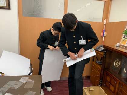 ポスターを袋に入れています。すでに慣れた手つきでした。
