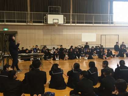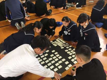 1年生にとっては中学校で初めての「百人一首大会」。5人グループが基本のクラス対抗戦(獲得枚数を競う)で、クラスのために一枚でも取ろう!という意気込みが伝わってきました。ここ何日か寒さが厳しかったのですが、今日は少し暖かく、体育館にも優しい陽が差し込んでいました。百人一首大会の後はクラス対抗「ぼうずめくり」もあり、体育館のスクリーンに映し出される札が「お姫様か、お坊さんか」でとても盛り上がっていました。