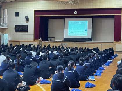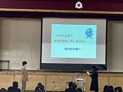 12月3日(金)5限 体育館にて、2.3年生を対象に、学校薬剤師の関野裕子先生による『薬物乱用防止教室』が開催されました。