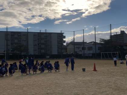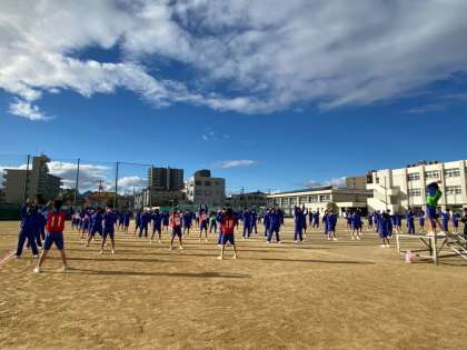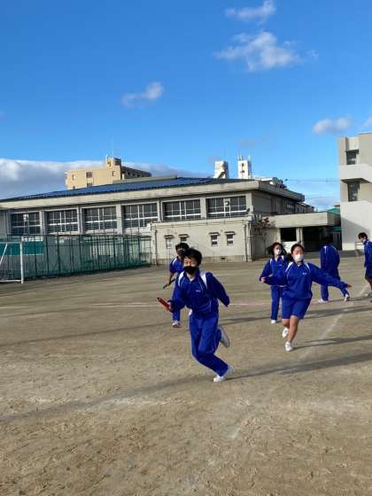 12月13日(月)6時間目、青空の下、2年生は、クラス対抗全員リレー大会を行いました。全クラス、全力でバトンをつなぎ、応援もおおいに盛り上がりました。優勝は1組でした。