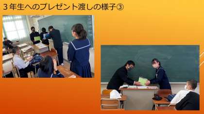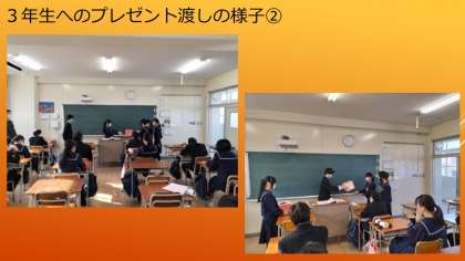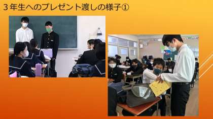 先週の金曜日の朝学活に、1・2年生の皆さんで作成した、卒業記念のしおりを3年生に渡しました。コロナウイルスの影響で、ほとんどの在校生は卒業式に出席できない代わりに、しおりにメッセージを込めさせてもらいました。3年生のみなさん、お世話になりました。また一般選抜を受ける3年生の方は頑張ってください。