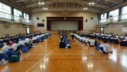 3年生修学旅行、体育館での出発式を終え、8時20分に出発しました。