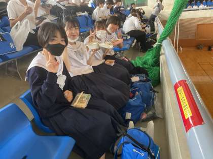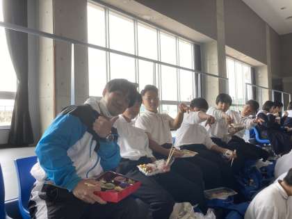 3年生修学旅行 福井県美浜町での昼食です。美味しそうに食べています。