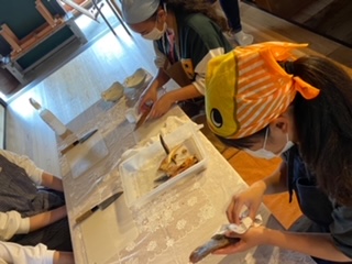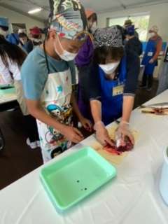 3年生修学旅行 体験別行動中 魚さばき体験中です。