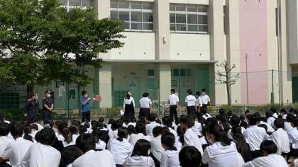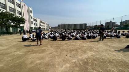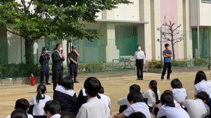 火災を想定した避難訓練が行われました。城東消防署の方々に来ていただき、水消火器による訓練などの指導をしていただきました。