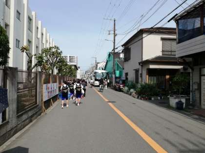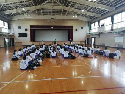 出発式にて、注意事項等の確認を行いました。いいお天気になり、活動も予定通りできそうです。1年生一泊移住は、8時50分に出発いたしました。