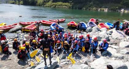 ラフティングが始まります! きれいな景色!気温は暑すぎるくらいです。 水の活動、気持ち良さそうです。